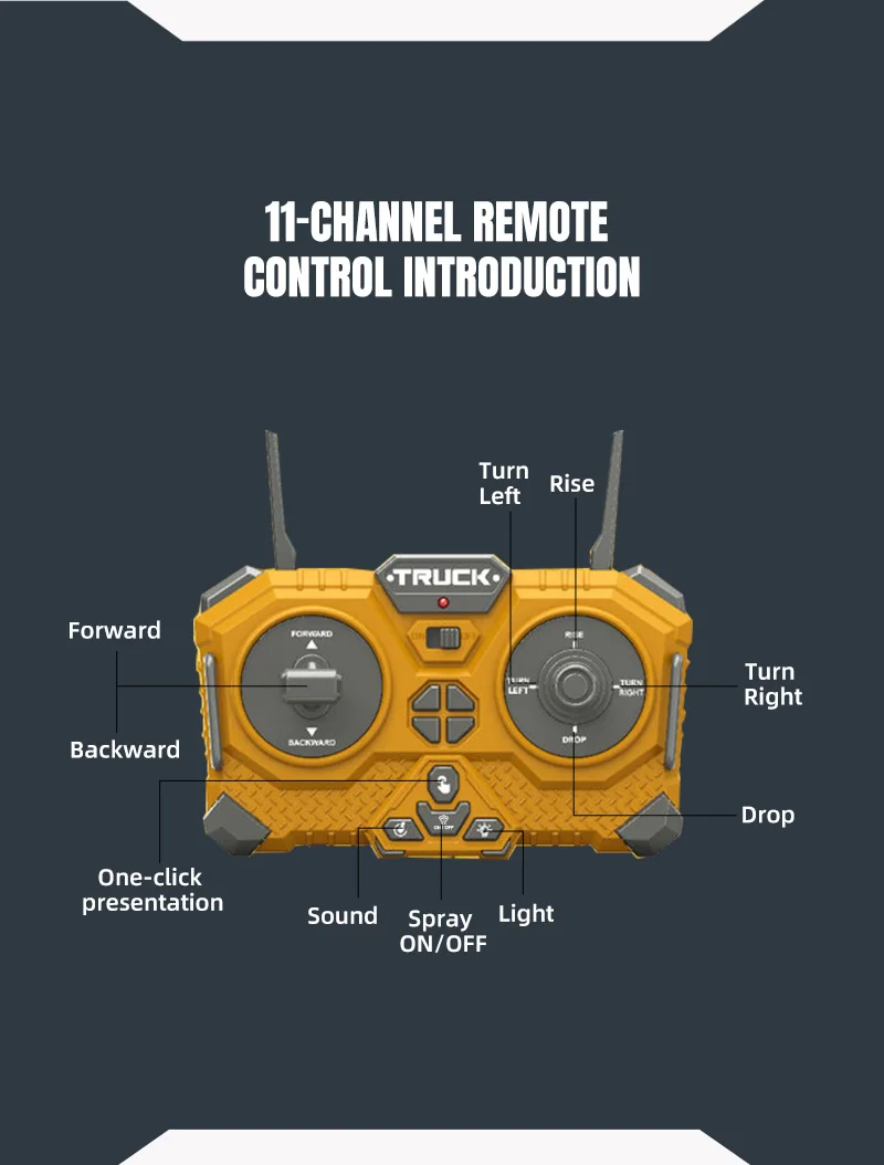 11 channel :Forward, backward, one-click demonstration, sound, light, left turn, right turn, push shovel up, push shovel down, with spray