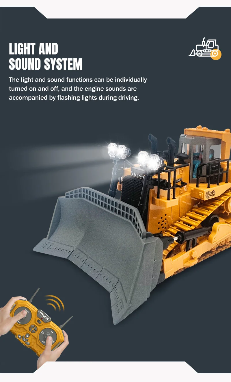 9 channel :Forward, backward, one-click demonstration, sound, light, left turn, right turn, push shovel up, push shovel down